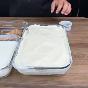 - Vou colocar numa forma, espalhar, passar biscoitos de maisena no leite, fazer 2 camadas com elas sobre o creme, colocar mais creme e repito todo o processo mais uma vez.