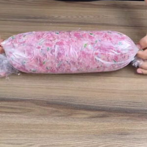 - Depois vou colocar no plástico e adicionar presunto ralado, queijo muçarela ralado, 1 cenoura pré-cozida fatiada, tiras de pimentão amarelo, brócolis ralado. Em seguida fecho e levo para a assadeira.