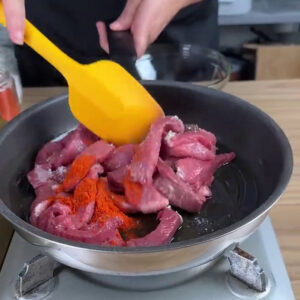 - Para começar, adiciono em uma frigideira com óleo 300g de carne, sal a gosto, páprica a gosto, pimenta do reino a gosto vou mexer com o fogo ligado e fritando.