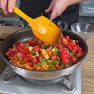 - Depois transfiro a carne para uma tigela, em seguida na mesma frigideira vou adicionar 1 cebola picada, 1 cenoura picada, 1 pimentão picado, 1 tomate picado e vou misturar bem.