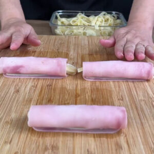 - Para começar, adiciono fatias de queijo sobre fatias de presunto em uma tábua. Depois adiciono macarrão cozido e em seguida vou enrolar.