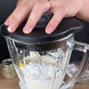 - Depois,em um liquidificador vou adicionar 1 caixa de creme de leite, 400g de requeijão, 1 colher de amido de milho e vou bater bem.