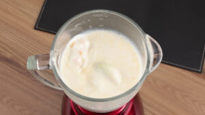 - Para começar, em um liquidificador vou adicionar 170 gramas de milho, 3 dentes de alho, 1 cebola, 50 gramas de parmesão ralado, 700 ml de leite, ½ colher de chá de sal, e vou bater.