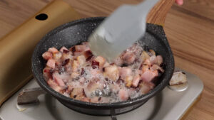 - Para continuar em uma frigideira, vou adicionar 200 gramas de bacon, e vou mexer até que esteja frito.