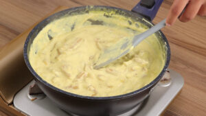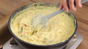 - Por fim vou adicionar queijo muçarela e vou mexer até que esse queijo se derreta.
