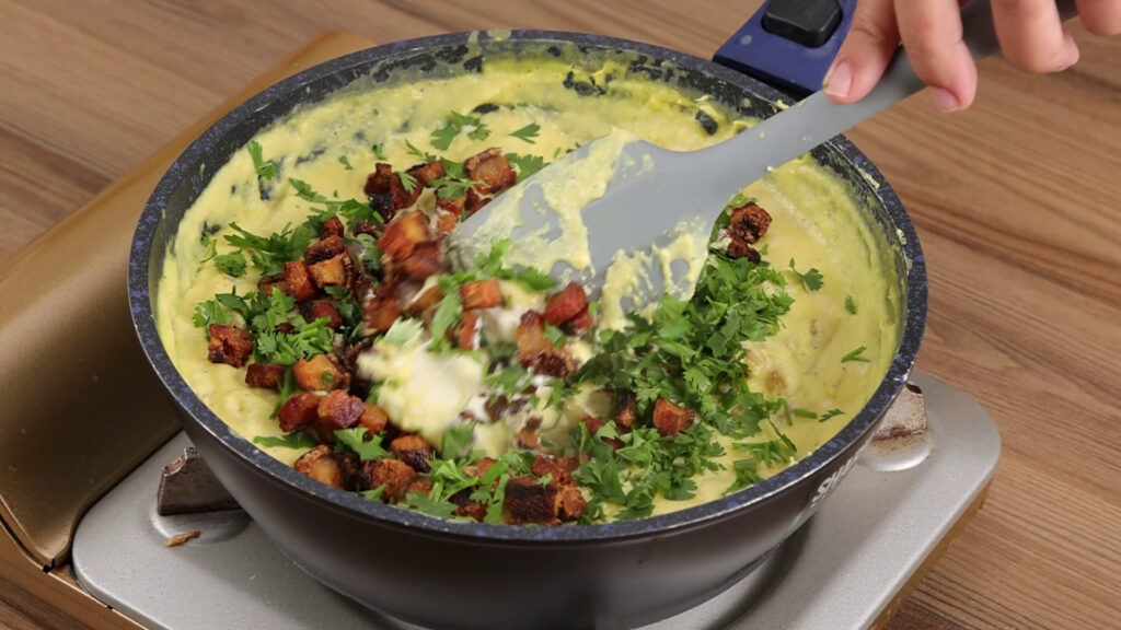 - Agora vou retirar a folha de louro e adicionar 1 colher de sopa de requeijão, o bacon, cheiro verde a gosto, e vou misturar novamente.