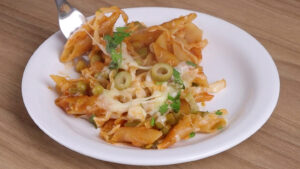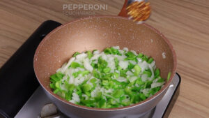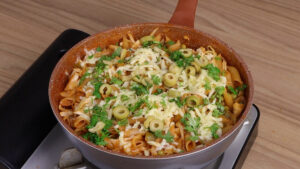 Macarrão na frigideira com pimentão e queijo muçarela