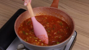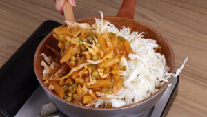 - Vou adicionar mais ½ xícara de água. Depois vou adicionar o repolho e vou mexer novamente.