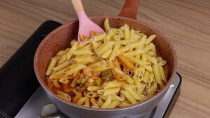 - Quando começar a ferver vou adicionar 300 gramas de macarrão pene e vou misturar.