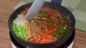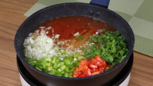 • Em uma panela vou adicionar 250 g de macarrão, 1tomate picado, 1 pimentão verde picado, 1 cebola picada, um pouco de cheiro verde, 340 g de molho de tomate, 3 dentes de alho, 1 colher de chá de pimenta do reino, 1 colher de chá de sal, 2 colheres de sopa de óleo e água até cobrir. Vou tampar a panela até começar ferver.