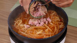 • Vou tampar novamente e deixar cozinhar por 10 minutos. Passado esse tempo vou destampar e adicionar 170 g de atum, vou misturar bem esse atum.