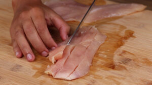 - Agora vou cortar 600 gramas de filé de peito de frango em tiras.