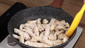 - Depois vou passar todo esse frango para uma travessa. E quando o macarrão estiver cozido vou despejar por cima do frango e vou misturar.