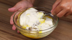 - Para continuar em uma tigela vou adicionar 3 ovos, 500 gramas de creme de leite, 1/2 colher de chá de sal, 1/2 colher de chá de pimenta do reino, 1 colher de chá de orégano e vou mexer.