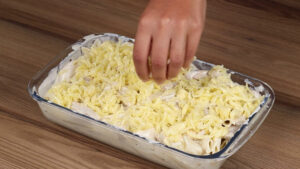 - Agora vou adicionar 50 gramas de queijo muçarela ralado por cima. E por fim vou levar ao forno a 180 graus por 25 minutos.