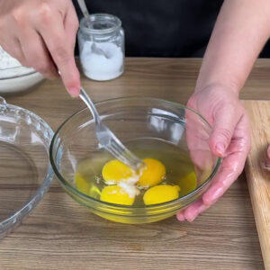 • Depois vou adicionar o queijo dentro da mortadela, em seguida em uma tigela adiciono 4 ovos, 1 pitada de sal e vou bater bem.