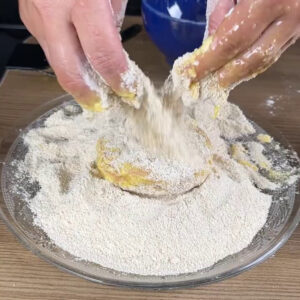 • Agora em outra tigela adiciono farinha de trigo, numa outra tigela adiciono farinha de rosca e vou empanar a mortadela.