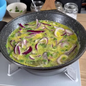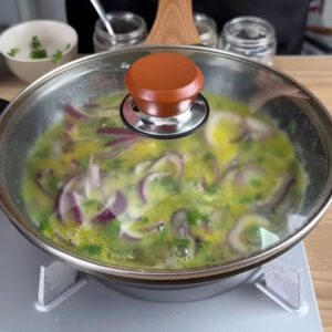 - Para começar, numa frigideira já com azeite e rodelas de cebola, vou colocar 6 ovos, uma pitada de sal, uma pitada de coentro em pó, uma pitada de pimenta do reino, cheiro-verde a gosto, vou deixar em fogo médio e mexer um pouco. Depois deixo por 5 minutos.