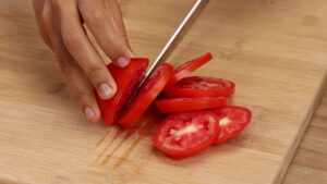 - Para esta receita vamos precisar de 1 tomate. Vou cortar esse tomate em rodelas.