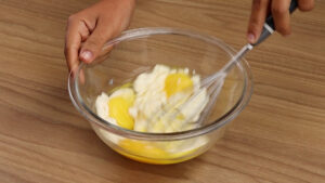 - Agora em uma tigela vou adicionar 4 ovos, 1 pitada de sal, 4 colheres de sopa de iogurte natural e vou misturar.