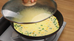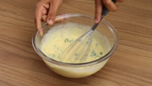 - Em seguida vou adicionar 5 ramos de cebolinha picada, 1/2 xícara de queijo muçarela ralado, e vou mexer novamente.
