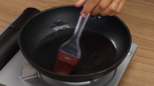 - Em uma frigideira vou adicionar 1 fio de óleo vegetal, e vou espalhar com ajuda de um pincel.