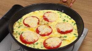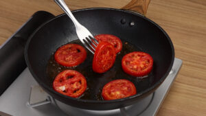- Após isso vou colocar todas as rodelas de tomate e vou deixar fritar 1 minuto de cada lado.