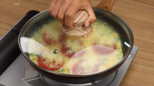 - Vou retirar os tomates, adicionar toda a mistura que fizemos, tampar e deixar que se frite por 2 minutos.