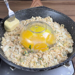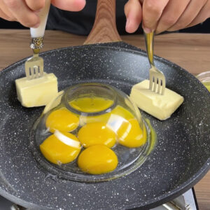 - Para começar, vou adicionar em uma frigideira em fogo médio seis gemas. Agora eu vou cobrir com uma tigela e vou estar passando duas barras de manteiga com ajuda dos garfos até derreter uma parte das barras.