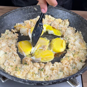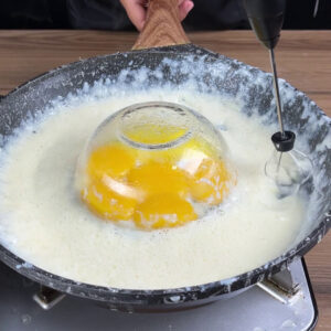 - Agora eu vou adicionar na frigideira as claras do ovos que tirei as claras. E vou bater essas claras com esse fuêzinho pequeno.