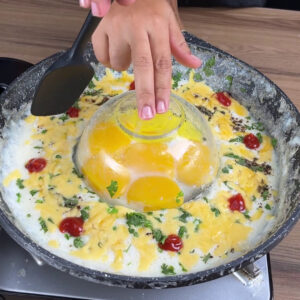 - Por fim vou retirar a tigela e separar as gemas e colocar num prato. E a nossa receita de omelete gourmet está pronta. Está uma delícia. O sabor fica bem diferenciado fazendo dessa forma.