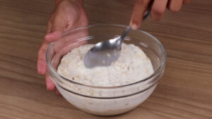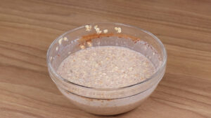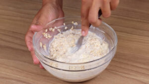 - Em uma tigela vou adicionar 100 g de aveia em flocos, 100 ml de leite vou misturar e deixar descansar por 5 minutos.