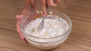 - Por fim vou adicionar 1 colher de chá de fermento em pó e mexer bem até agregar todo o fermento na massa.