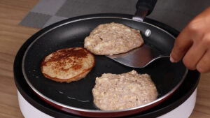 - Agora vou untar uma frigideira com óleo. E com uma colher de sopa vou adicionar várias poções da nossa mistura dessa forma. Depois de assar um lado vou virar para assar o outro lado.