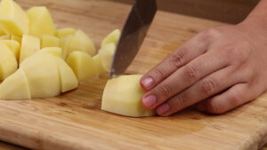 - Para a nossa receita nós vamos precisar de 6 batatas já descascadas, cortarei essas batatas ao meio e depois em pedaços menores.
