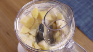 - Passarei as batatas e a cebola para dento de uma triturador de alimentos, vou adicionar também 3 colheres de sopa de creme de leite e triturar bem todos esses ingredientes.