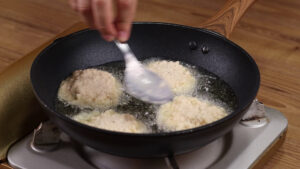 - Para continuar em uma frigideira em fogo baixo vou adicionar um pouco de óleo, e com uma colher de sopa vou adicionar várias porções da nossa massa para fritar.