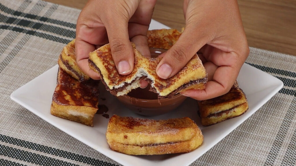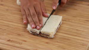 • Agora vou passar Nutela nessas fatias, vou fechar com outra fatia e depois dividir esse pão ao meio.