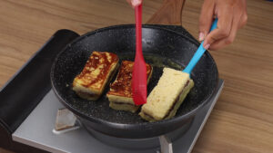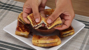 • Para continuar em uma frigideira vou adicionar 1/2 colher de sopa de manteiga e vou espalhar para que se derreta por completo. Depois vou empanar esses pães nos ovos batidos e adicionar na frigideira para fritar. E quando um lado estiver pronto, vou virar para fritar o outro lado. Vou fazer isso com todos os pães.