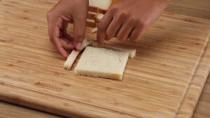 • Para esta receita vamos precisar de 6 pães de forma. Vou começar retirando as bordas desses pães.