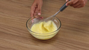 • Em seguida em uma tigela vou adicionar 2 ovos, 60 ml de leite, 1 colher de sopa de mel e vou misturar bem esses ingredientes.
