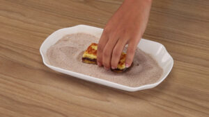 • Após isso em um recipiente vou adicionar 1 xícara de açúcar, 1 colher de sopa de canela em pó e vou misturar. Para finalizar vou passar os pães nessa mistura.