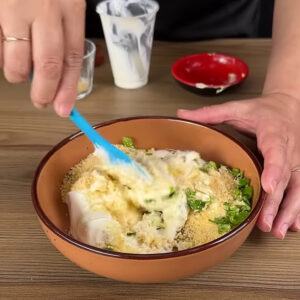 - Numa tigela coloco 4 dentes de alho, vou amassar e depois adicionar 2 colheres de manteiga, 1 pote de requeijão, 50g de queijo parmesão ralado, cheiro-verde e misturar.