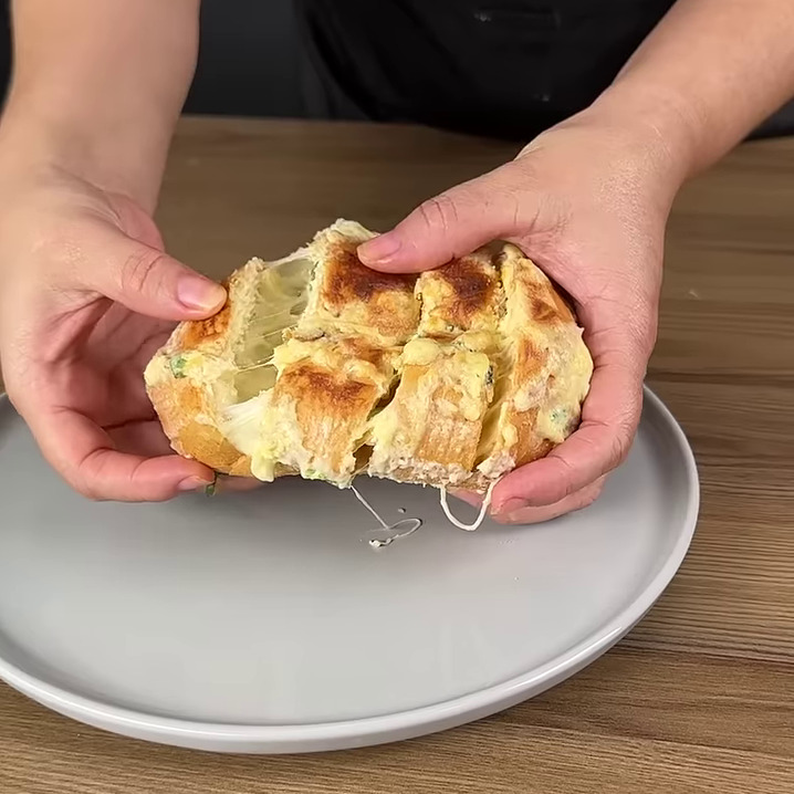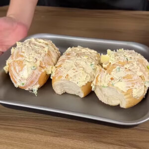 - Agora vou cortar os pães, passar a pasta tanto por dentro quanto por fora nos pães . Vou levar ao forno e deixar até dourar.