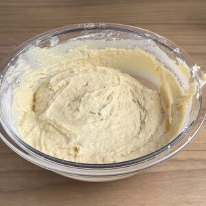 - Vou colocar metade da mistura na tigela, adicionar 1⁄2 kg de massa e misturar.