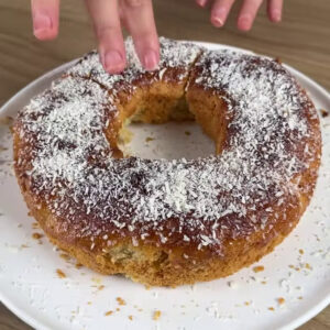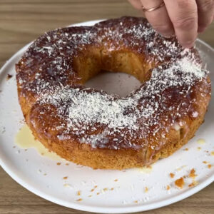 - Depois de assada, vou passar leite condensado e coco ralado por cima.