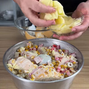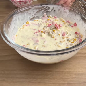 - Numa tigela vou adicionar 4 ovos, 1 colher de pimenta do reino, 1 caixa de creme de leite e mexer. Depois adiciono 2 colheres de requeijão, 1 colher de sal, azeitonas a gosto, 1 caixa de milho verde, 1 tomate picado, queijo e presunto cortados, vou misturar tudo.