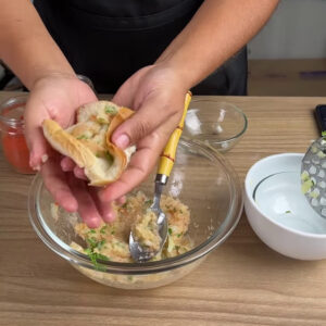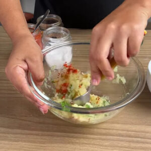 - Em seguida em uma tigela adiciono uma batata grande cozida , 1 colher de cheiro-verde, 1 colher de cebola , 1 colher de Sal, 1 ⁄ 2 colher de pimenta calabresa , 1⁄2 colher de páprica, amasso e misturo tudo.