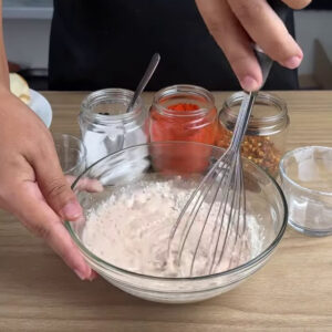 - Para fazer a cobertura , adiciono 1⁄2 xícara de farinha de trigo, 1⁄2 colher de pimenta calabresa, 1⁄2 colher de páprica , 1⁄2 colher de sal, 1/2 xícara de água e misturo tudo.