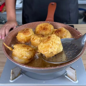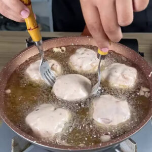 - Passo nos bolinhos e coloco para fritar até dourar !